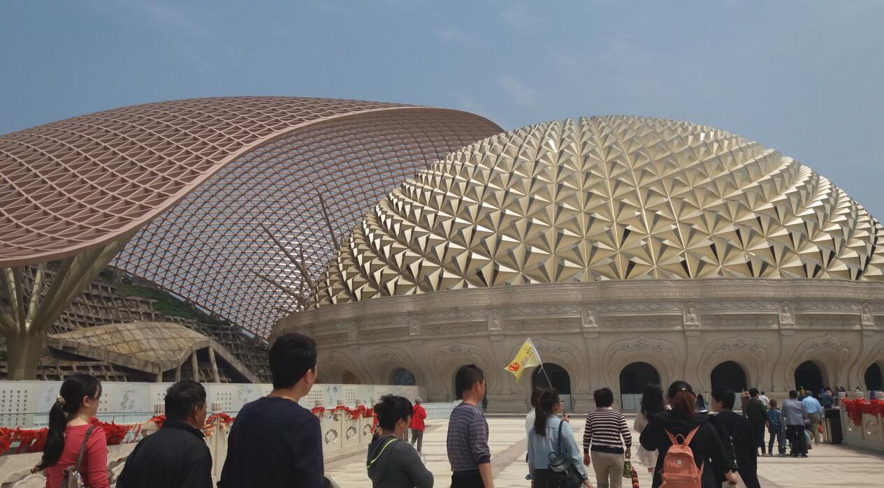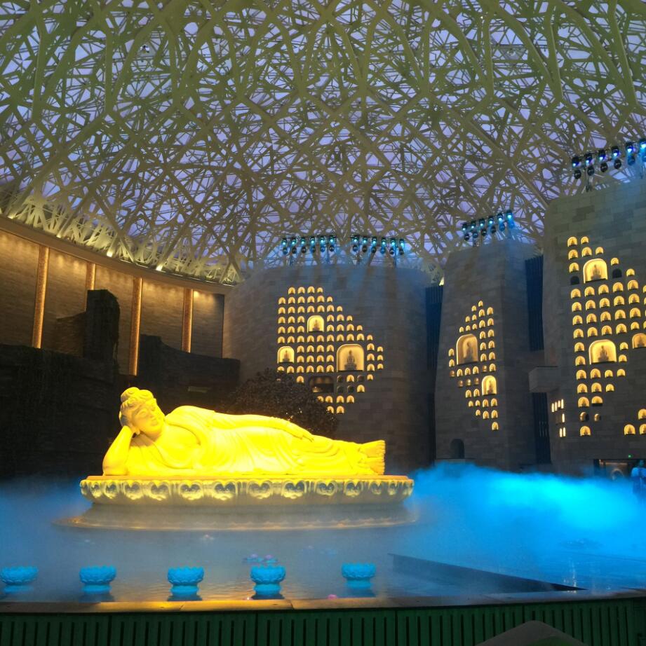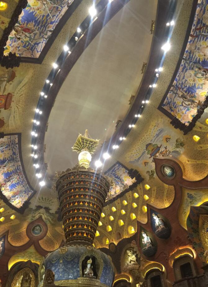 牛首山佛頂宮工程的工程的設計和建造匯聚了全國佛學界和藝術界的一流專家團隊。整個佛頂宮總建筑面積近10萬平方米,主體建筑共9層,地下利用礦坑建設了6層,規模宏大、建筑奇偉,在當今佛教文化建筑中少有。建成后的佛頂宮 ,礦口經過改造,變為“七寶蓮道”。佛頂宮呈半圓狀,整體造型是以巨型蓮花托起佛頂發髻的摩尼穹頂,直徑超過200米,非常輝煌壯觀。供奉佛祖頂骨舍利的圣塔,通體為青銅鑄胎鍛造,并運用鎏金、水晶、琉璃、寶石等佛教“七寶”鑲嵌,集青銅、鎏金、掐絲琺瑯、雕塑、鏨刻等數十種傳統工藝,再加激光投射,精美絕倫。