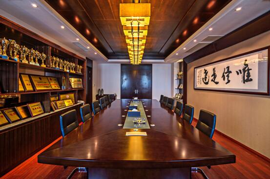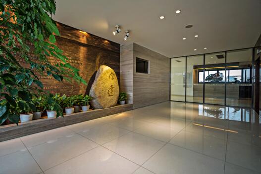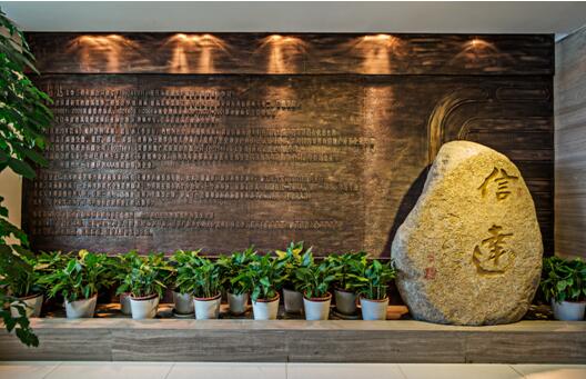 定制的背景, 以古銅色調(diào)呈現(xiàn), 企業(yè)的發(fā)展在此一 一敘述, 著名書法家徐安碧題的信達, 剛勁, 有力, 寓意深厚, 淺色石材與背景形成了色調(diào)上的對比。電梯廳造型簡潔, 構(gòu)圖適當(dāng), 透明的電動移門將前臺接待與電梯廳連在了一起, 相互映照。