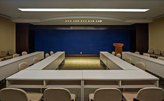 深藍色背景加強了空間的質(zhì)感, 對稱布置的桌椅, 平衡了空間的秩序。